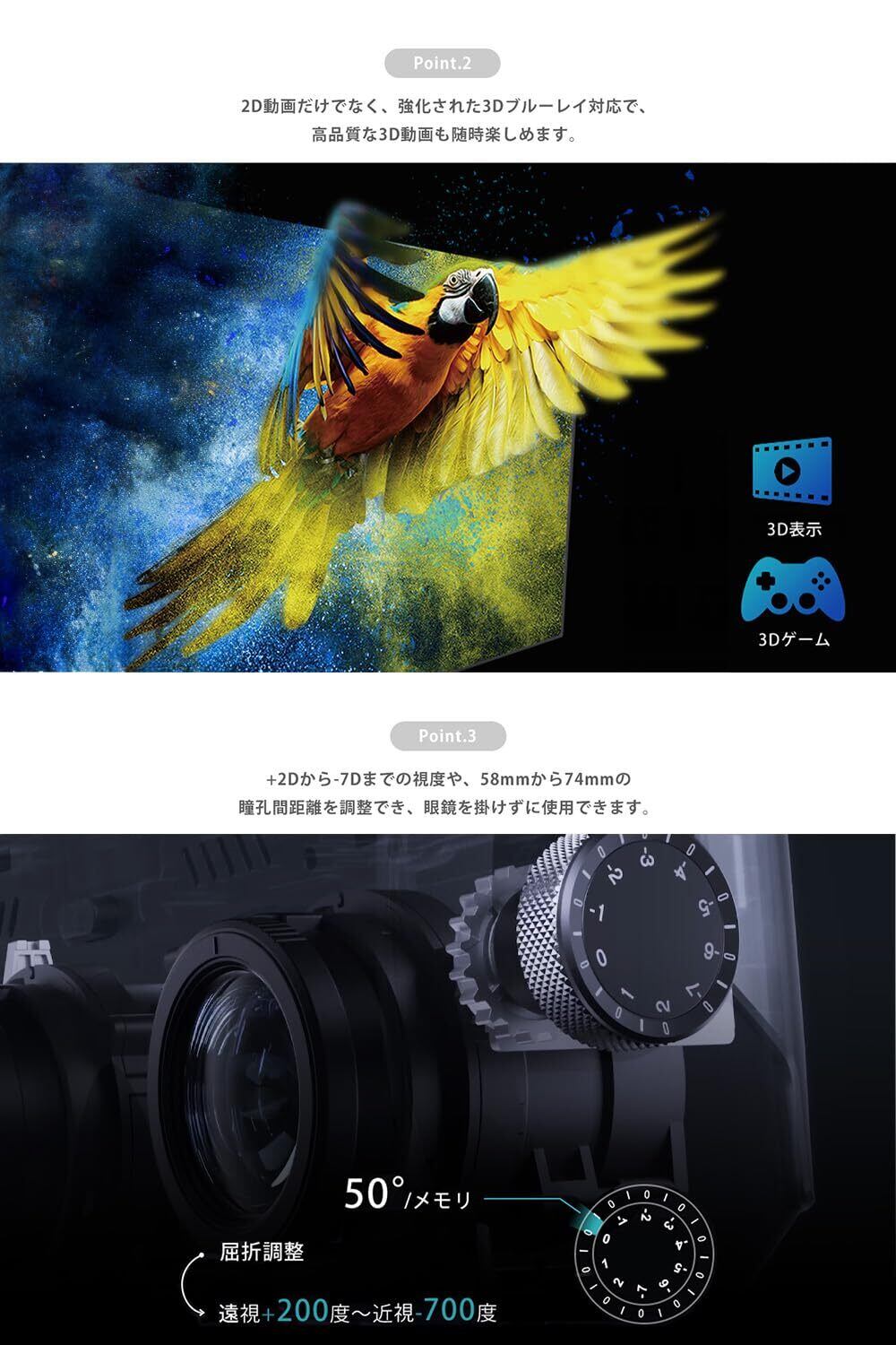 特徴 軽量, IPD調整ダイヤル, 調整可能なヘッドバンド, デュアルAMOLEDスクリーン