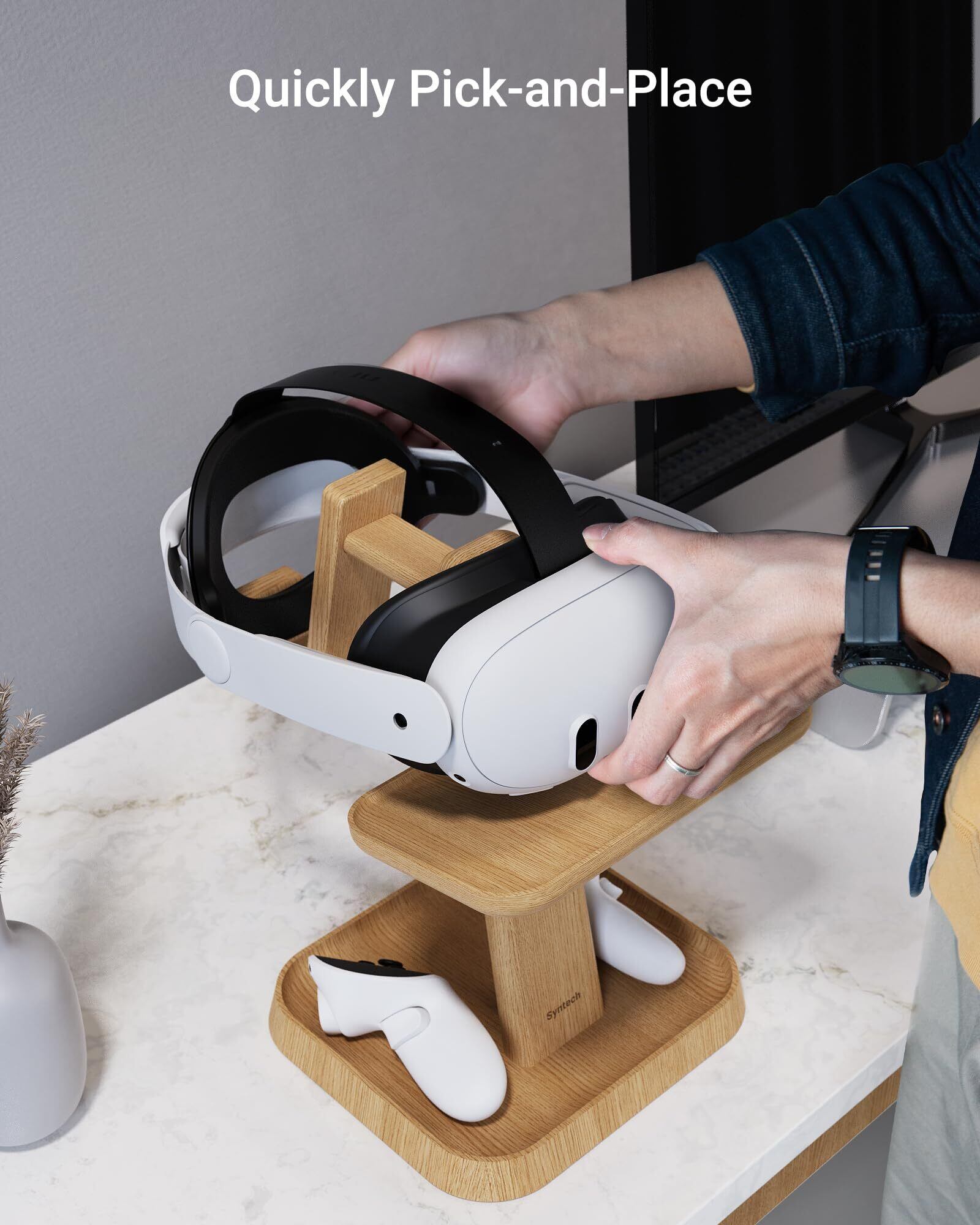 Syntech VRスタンドウッド Meta Quest 3s/3/2/VisionPro/Pico 4対応 ユニバーサルQuest3スタンドホルダー VRアクセサリー用ストレージベース付き、エリートストラップ付きゲーミングヘッドセット