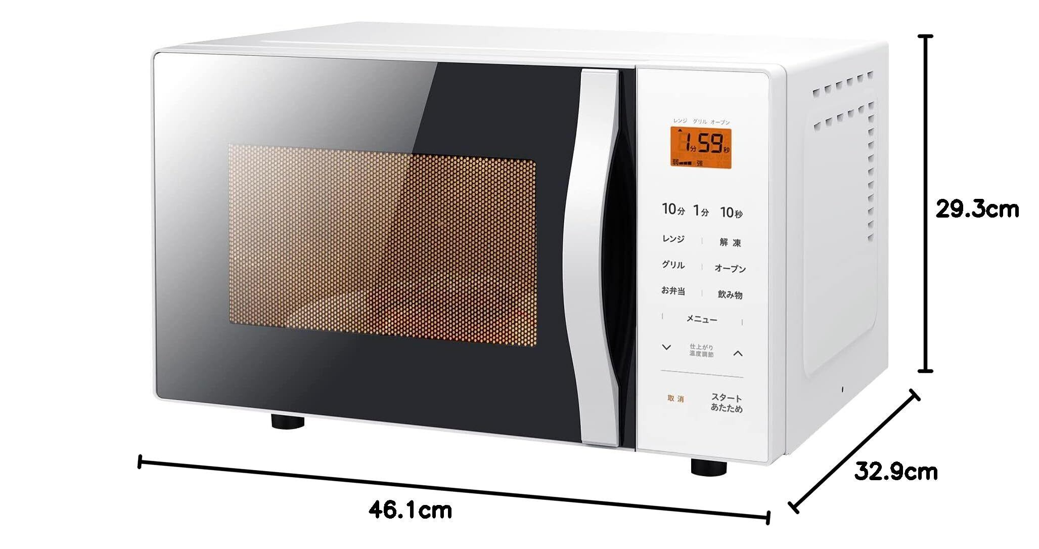 【商品仕様】本体サイズ:幅46.1×奥行32.9×高さ29.3cm、本体重量:13.3kg、庫内サイズ:幅28×奥行28.6×高さ約16.8cm、ターンテーブル直径:27cm、庫内容量:16L、電源コードの長さ:1.5m、電源: AC100V(50/60Hz共用)、消費電力:[レンジ=920/1250W(50/60Hz)][オーブン=1250W][グリル=1250W]、レンジ高周波出力:650W(60Hzのみ)/500W/200W、期間:お買い上げ日より1年間(の範囲については、取扱説明書をご確認ください。(一般家庭用以外(業務用など)に使用された場合の故障及び損傷などは対象外となります))