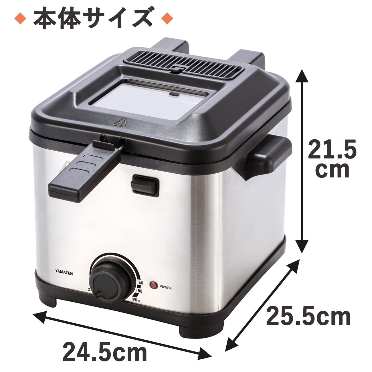 【商品仕様】◇本体サイズ:幅24.5×奥行25.5×高さ21.5cm ◇本体重量:2.2kg ◇容量:1.5L(油量:1350g) ◇電源コードの長さ:2.0m ◇電源:AC100V ◇消費電力:800W ◇温度調節:約160~190℃(油温) ◇期間:お買い上げ日より1年間(の範囲については、取扱説明書をご確認ください。(一般家庭用以外(業務用など)に使用された場合の故障及び損傷などは対象外となります))