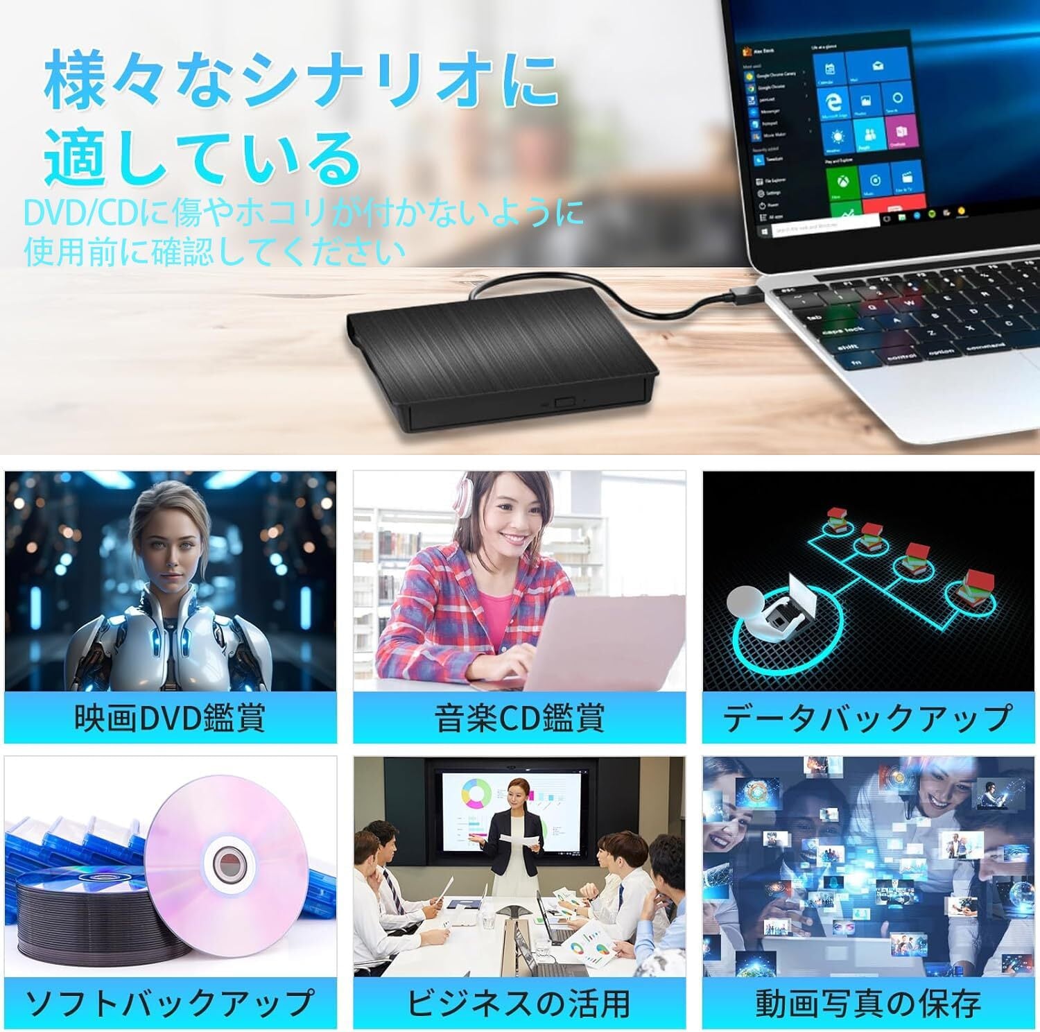 外付けDVDドライブ 高速処理 8XDVD& 24XCD 光学ドライブ外付け 読取/書込可 バスパワー USB 2.0/3.0&Type-C両接続 外付けCDドライブ (ブラック)