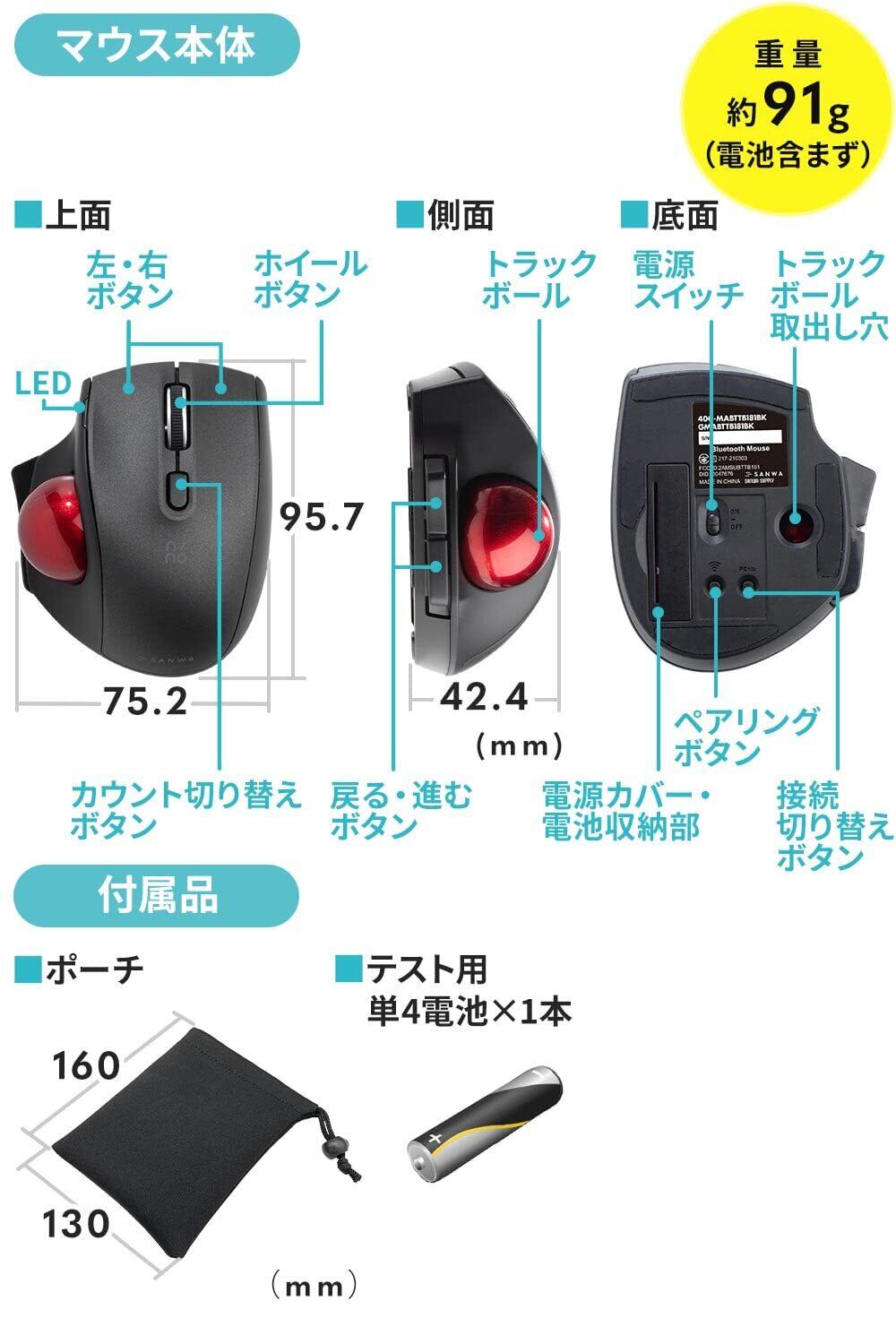 サンワダイレクト トラックボールマウス ワイヤレス 小型 静音 Mac/Windows対応 5ボタン(戻る/進むボタン搭載) ブラック 400-MAWTB180BK