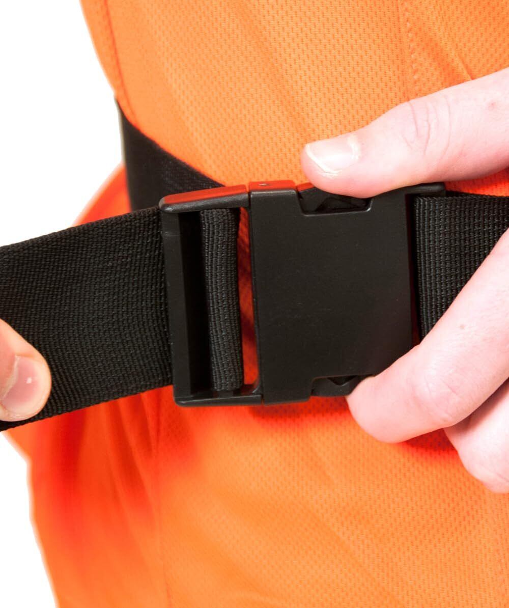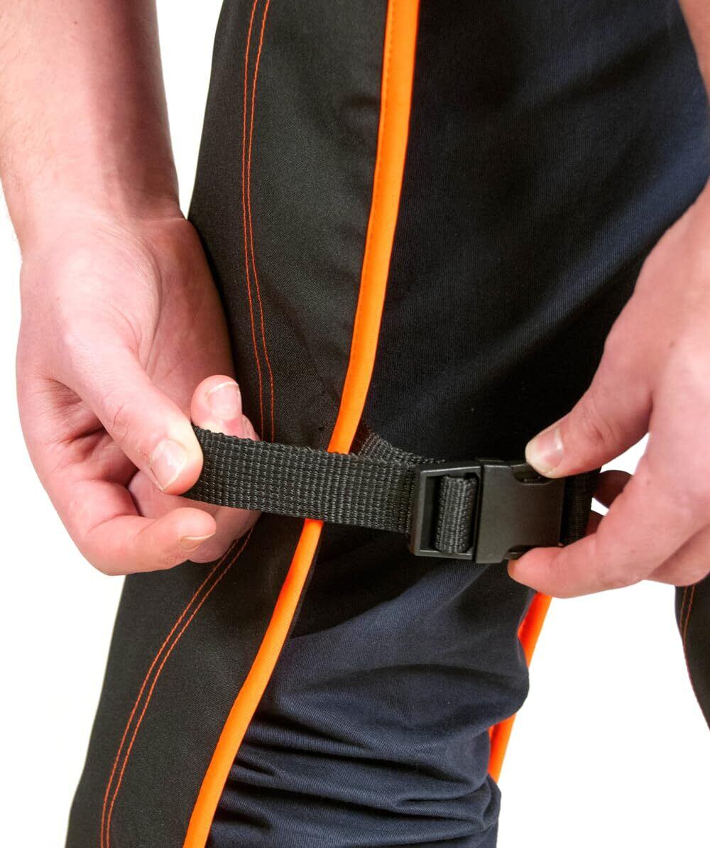 チェンソー作業用防護チャップス。ウエスト調整可能、脚裏側を4つの調整可能なバックルで固定。