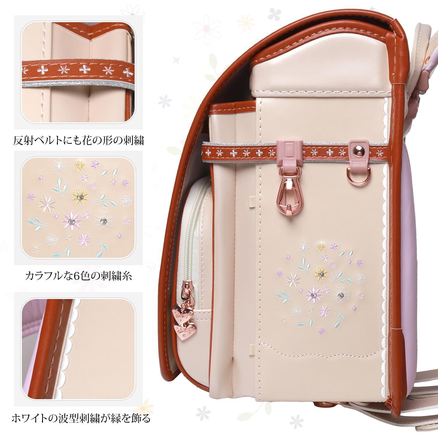 【2025向け】最新女の子向けランドセル、マーガレットモデル、ローズゴールド系金具、5色展開(桜色/水色/紫色/月白/ベジュー)。 フレッシュでかわいい小花モチーフは、高学年になっても飽きさせない美しさと機能性を兼ね備えた上品なランドセルです! ツヤありパール生地使用、カラフルな刺繍付き、人工ダイヤモンド飾り、ビーズチェーンDIY可能、 楽しさいっぱいの女の子ランドセルです。