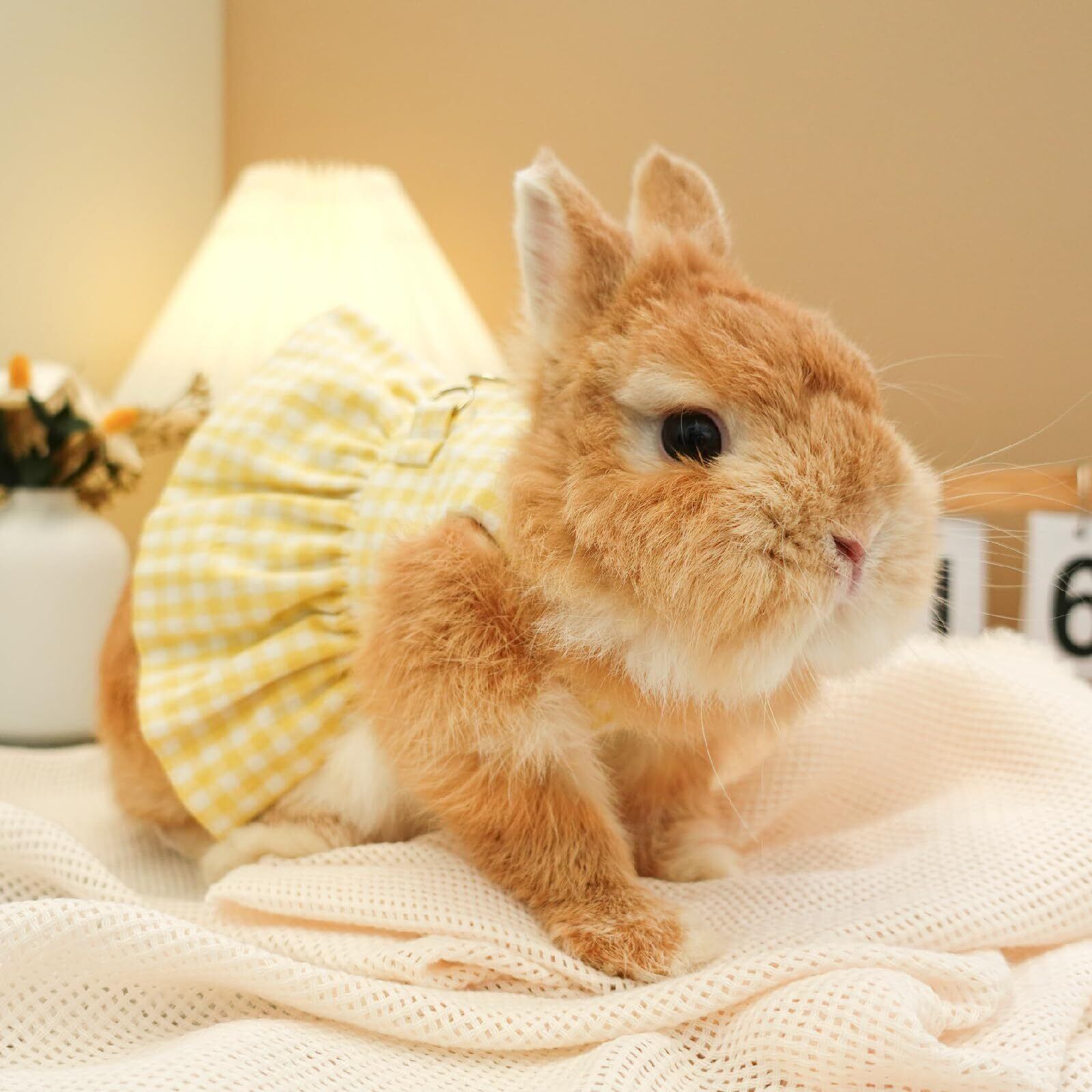 teemoyaya うさぎ 服 ネザーランドドワーフ スカート ワンピース ハーネス 袖なし 柔らかい 通気性 綿製 お散歩用 お出かけ 迷子防止 簡単着脱 記念撮影 可愛い 田舎風 春 夏 秋 冬 イエローチェック柄 S