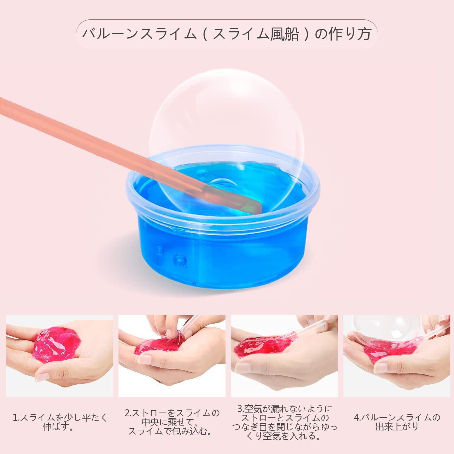 ストローでスライムに空気を入れ込むことで、風船の様に膨らませるという面白いスライムが作られます。