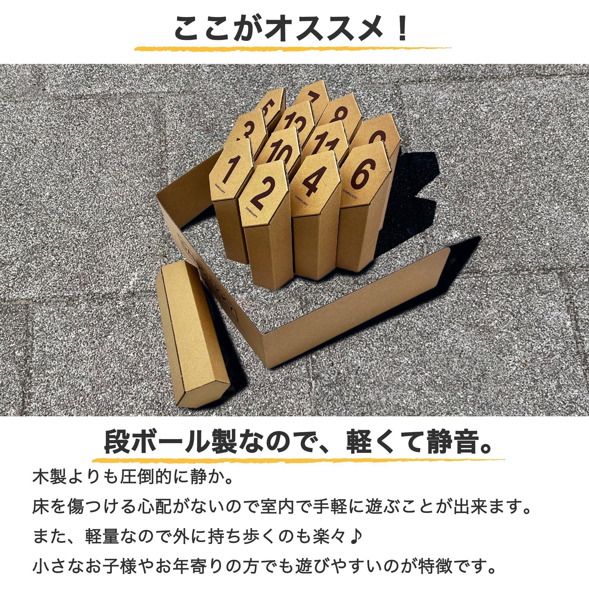 【セット内容】スキットル等(段ボール製・組み立て式)、収納ボックス、説明書 【原産国】日本 【プレイ人数】2人~ 【組立て目安時間】約30分