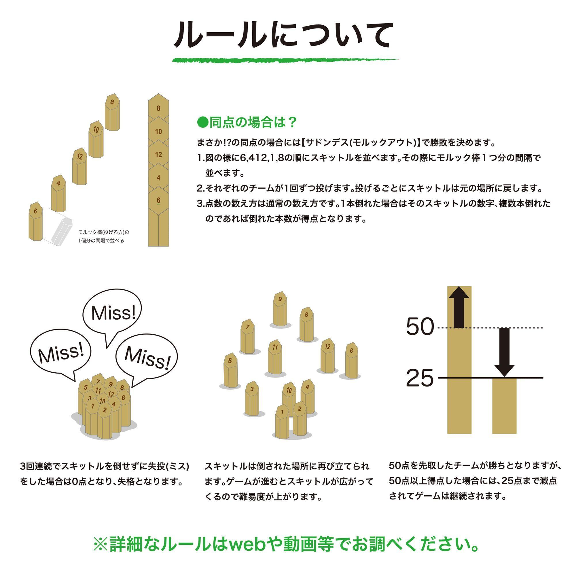 スキットルを繰り返し倒しあい、倒れた内容により得点を加算して行きピッタリ50点になれば勝ち!2人以上から遊ぶことができます。