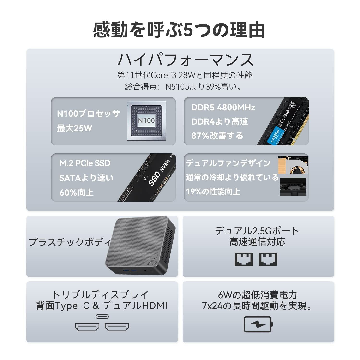 【Beelink Intel EQ12-N100 プロセッサー】新しくアップグレードされたEQ12-N100 Mini pcは、Intel Processor Alder Lake-N100 (4C/4T, up to 3.4GHz) processorを採用しています。インテルのAlder Lake-Nシリーズプロセッサーは、エントリーレベルのPCシステム設計のための低消費電力チップとして、安価に設計されています。