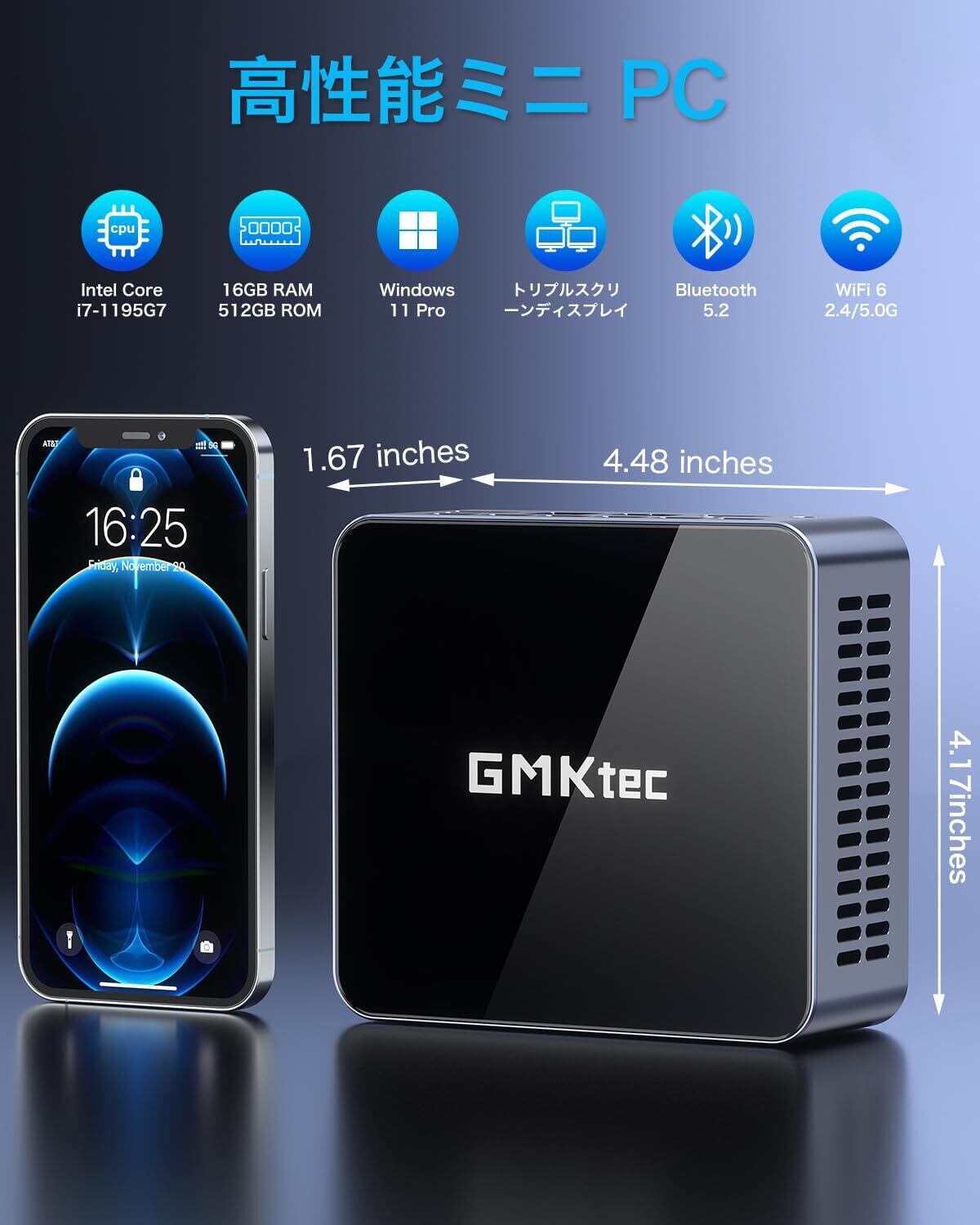【新春セール】GMKtec ミニPC Windows 11 Pro Intel Core i7-1195G7 (ターボ 5.0 GHz) 512GB SSD 16GB DDR4, デスクトップ WiFi 6, USB3.2, BT 5.2, DP, HDMI, RJ45 2.5G