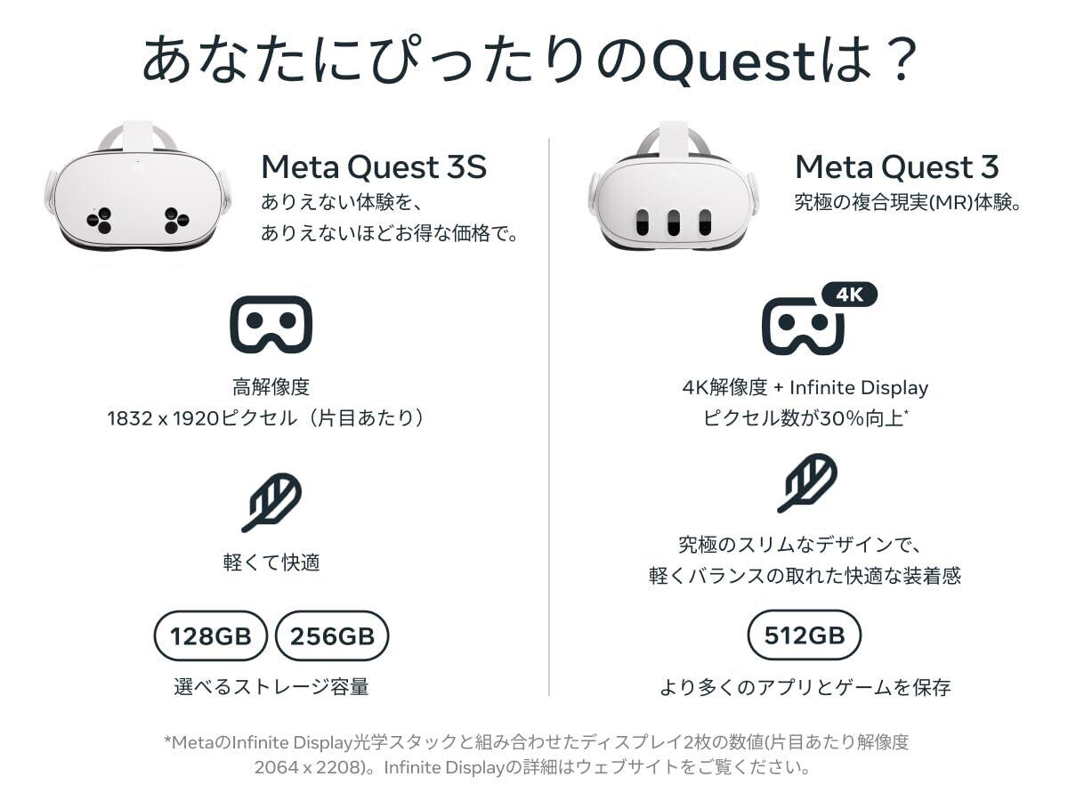 Meta Quest 3Sの魔法を体験しよう。デジタルのゲームやエクササイズ、エンターテインメントを現実空間にミックス。大好きなことを、まったく新しい方法で楽しめる。どんな部屋でも、没入感あふれる映画館に変えられる。お気に入りのゲームの世界に飛び込んで冒険することもできる。友達がどこにいても、同じ場所にいるような感覚で一緒に過ごせる。ワイヤレスで軽いMeta Quest 3Sだから、自由自在に動き回れる。ありえない体験を、ありえないほどお得な価格で。さあ、無限に広がる世界に飛び込もう。お子様の安全な使用方法をオンラインでご確認ください。対象年齢は10歳以上です。