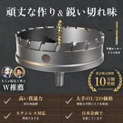【被削材】ステンレス板 (10mm以下)、金属、鋼板、鉄 板 用、アルミ 等 合金板、木材、外壁、(エアコン・換気扇の取付け等)、キッチン周り、アクリル、発泡スチロール、薄いモルタル、薄いコンクリート パネル ボード、人口大理石など ※U字側溝等の二次製品にはお使いいただけません。