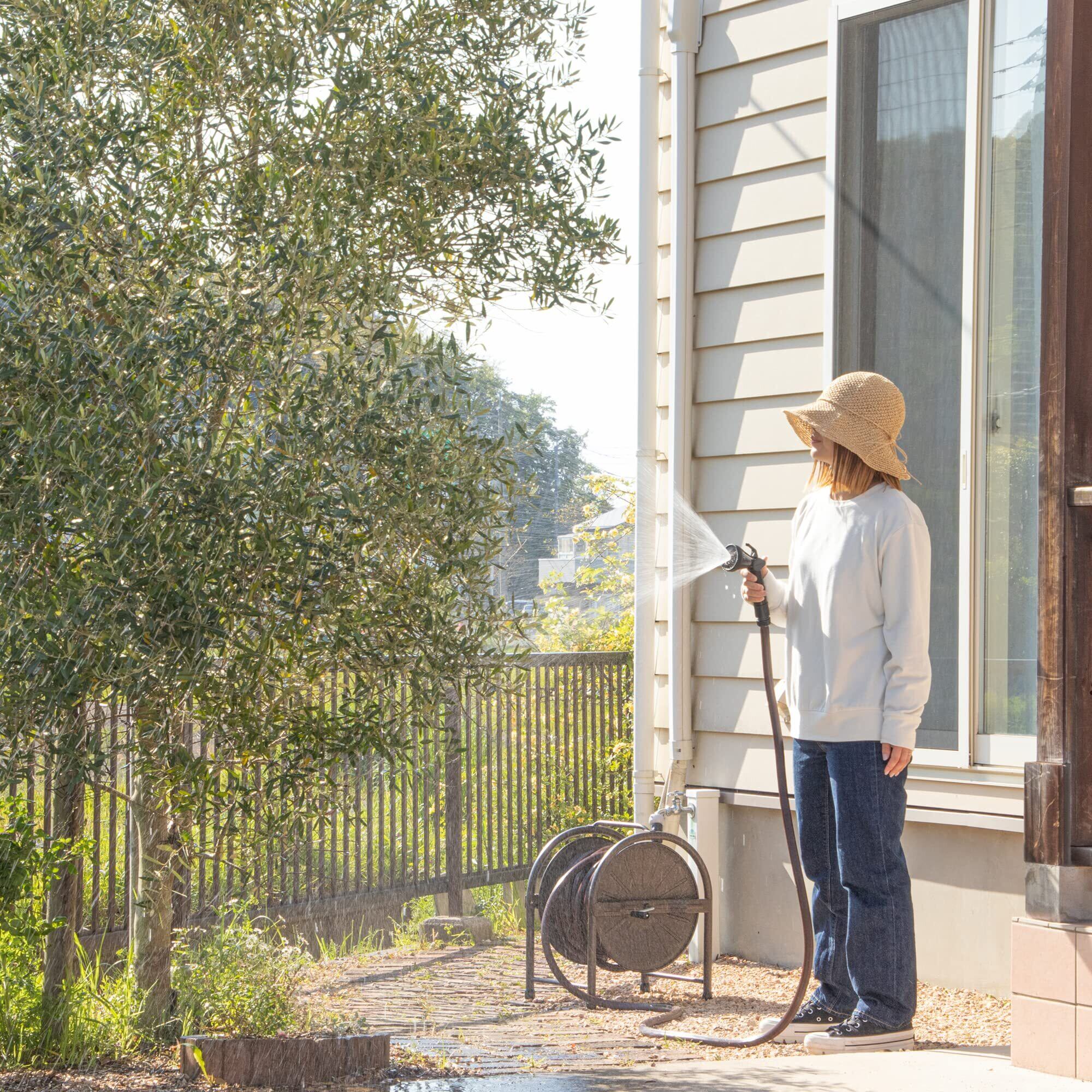 ねじれにくい、高密度ストリングス構造の内径15mmホースを使用。メタル製で耐久性が高く、散水作業に便利な"大水量ひっかけメタルノズル"を使用。高級感のあるメタリック塗装のブラウンカラーでお庭や外壁に馴染むスタイリッシュなデザインです。